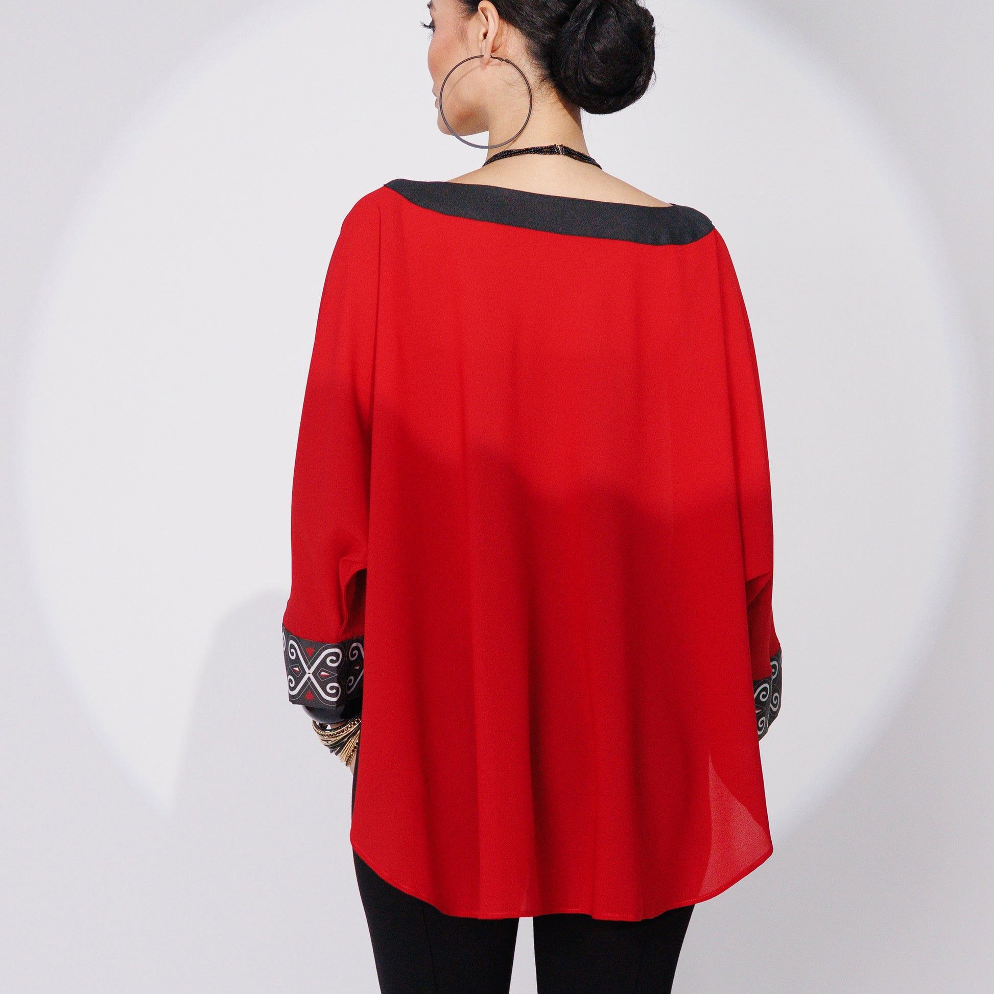 This red chiffon caftan brings effortless elegance with its loose cut and flowing curved hemline. The black self-facing neckline perfectly defines your silhouette, no necklace needed. Bold, beautiful, and effortlessly chic.