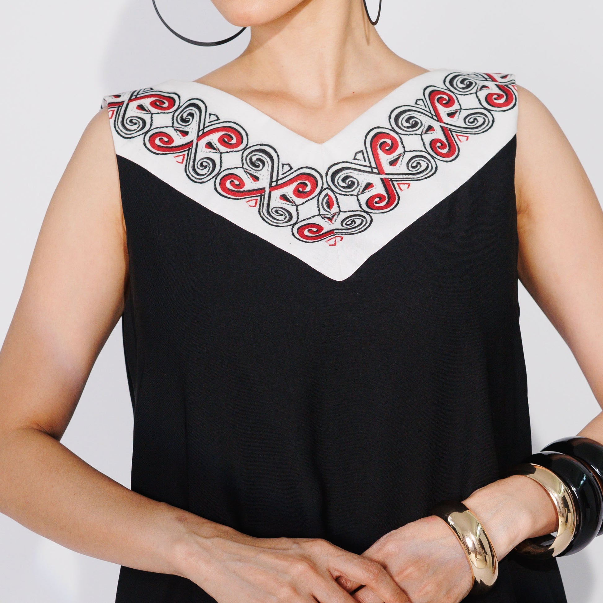 Simple, sleek, and effortlessly stylish. This black sheath dress with a flattering V-neckline and subtle print details is all about clean lines and comfort. Side pockets and an A-line silhouette make it perfect for any body type. Elevate your look, effortlessly.